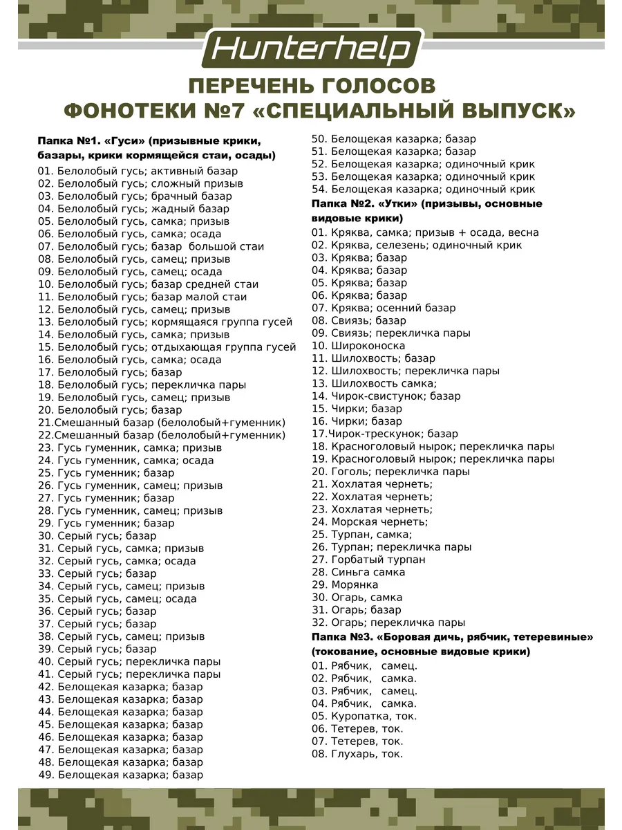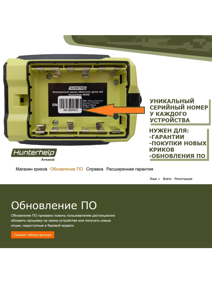 -Поддерживает сервис Arsenal, Обновление фонотеки и прошивки манка Hunterhelp, не выходя из дома.