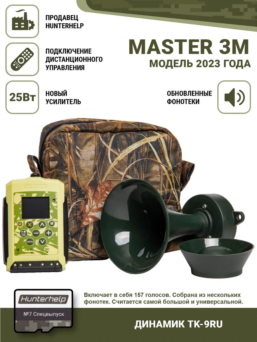 Hunterhelp MASTER 3M — эффективный, громкий и надежный манок, теперь с усилителем 25 Вт и WiFi модулем! Большой TFT дисплей и поддержка дистанционного управления. Динамик ТК9-RU реалистично воспроизводит голоса гусеобразных, кабана, косули, вороны. Направленный рупор существенно увеличивает дальность подманивания. Может быть использован для манения утки, селезня, гуся, и многих других видов животных. Карта голосов в комплекте.