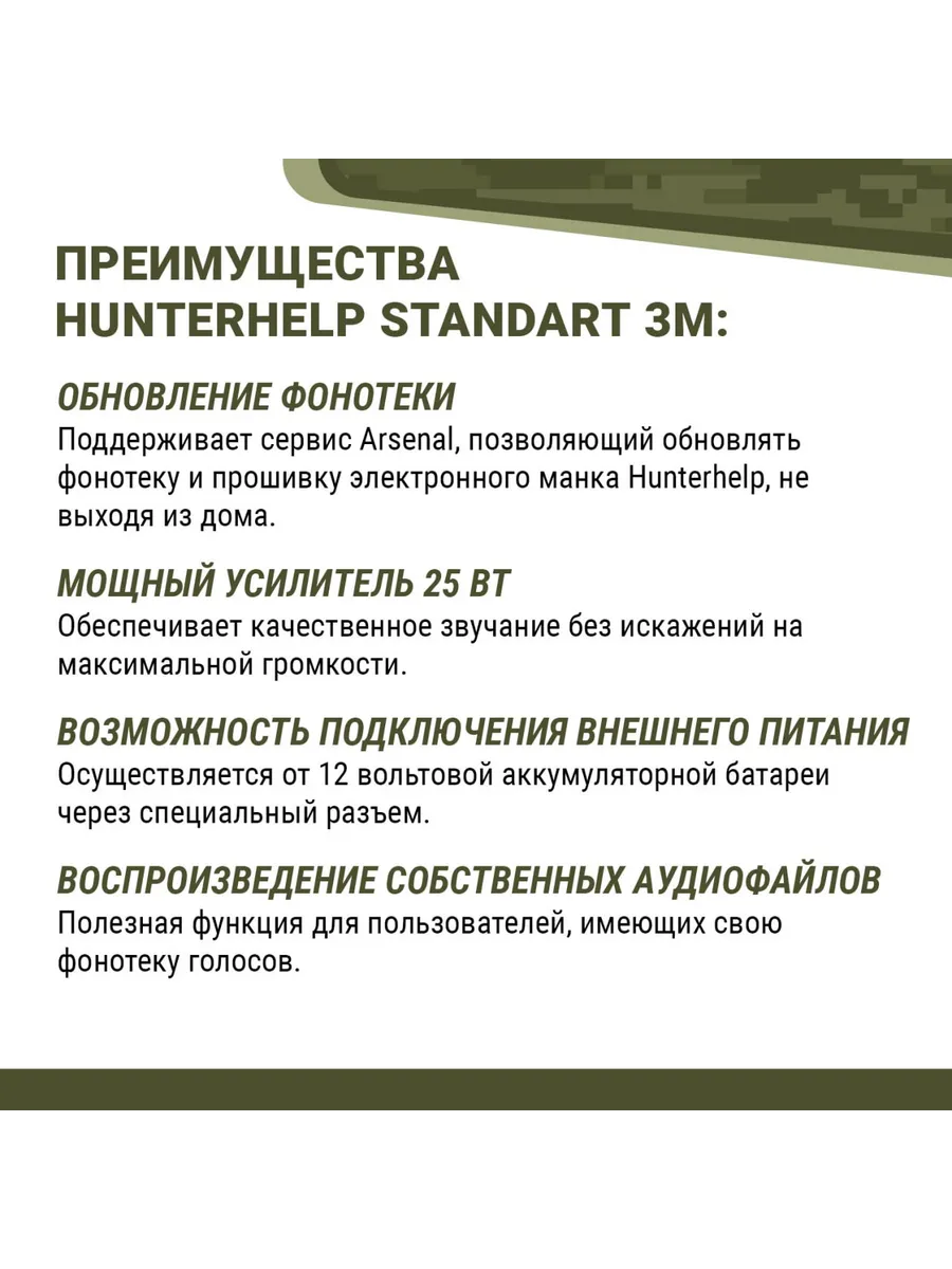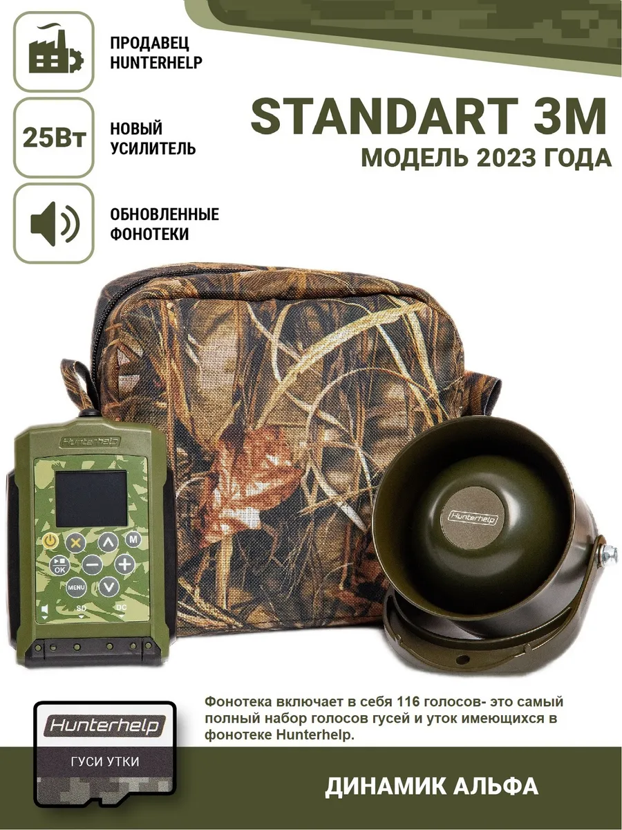 Hunterhelp STANDART 3M — эффективный, громкий и надежный манок по доступной цене! С новым большим TFT дисплеем! Удобная настройка. Динамик Альфа — это лучший динамик для охоты, он может реалистично и громко воспроизвести любой звук (от свиста рябчика до рёва хищников и копытных) за счет расширенного диапазона частот. Альфа по характеристикам превосходит известных итальянских конкурентов. Голоса в комплекте.
