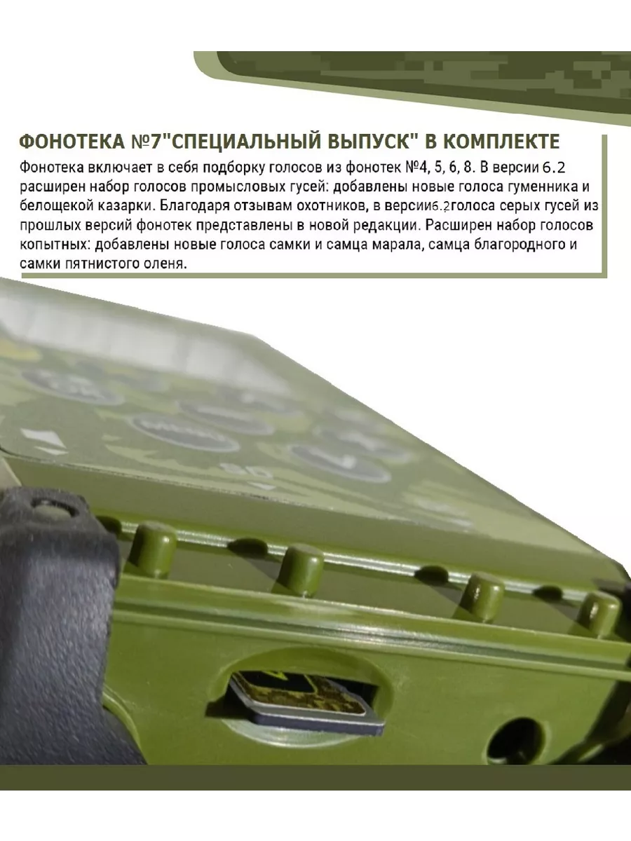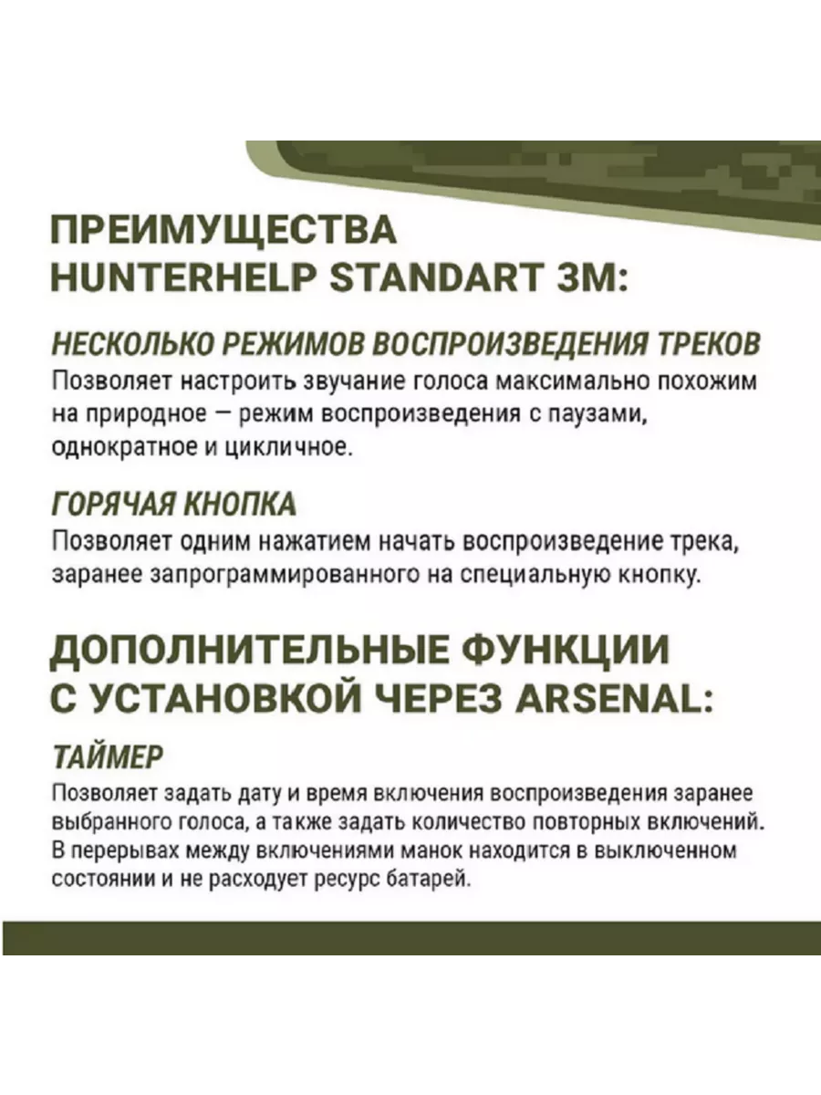 -Поддерживает сервис Arsenal, позволяющий обновлять фонотеку и прошивку электронного манка Hunterhelp, не выходя из дома.