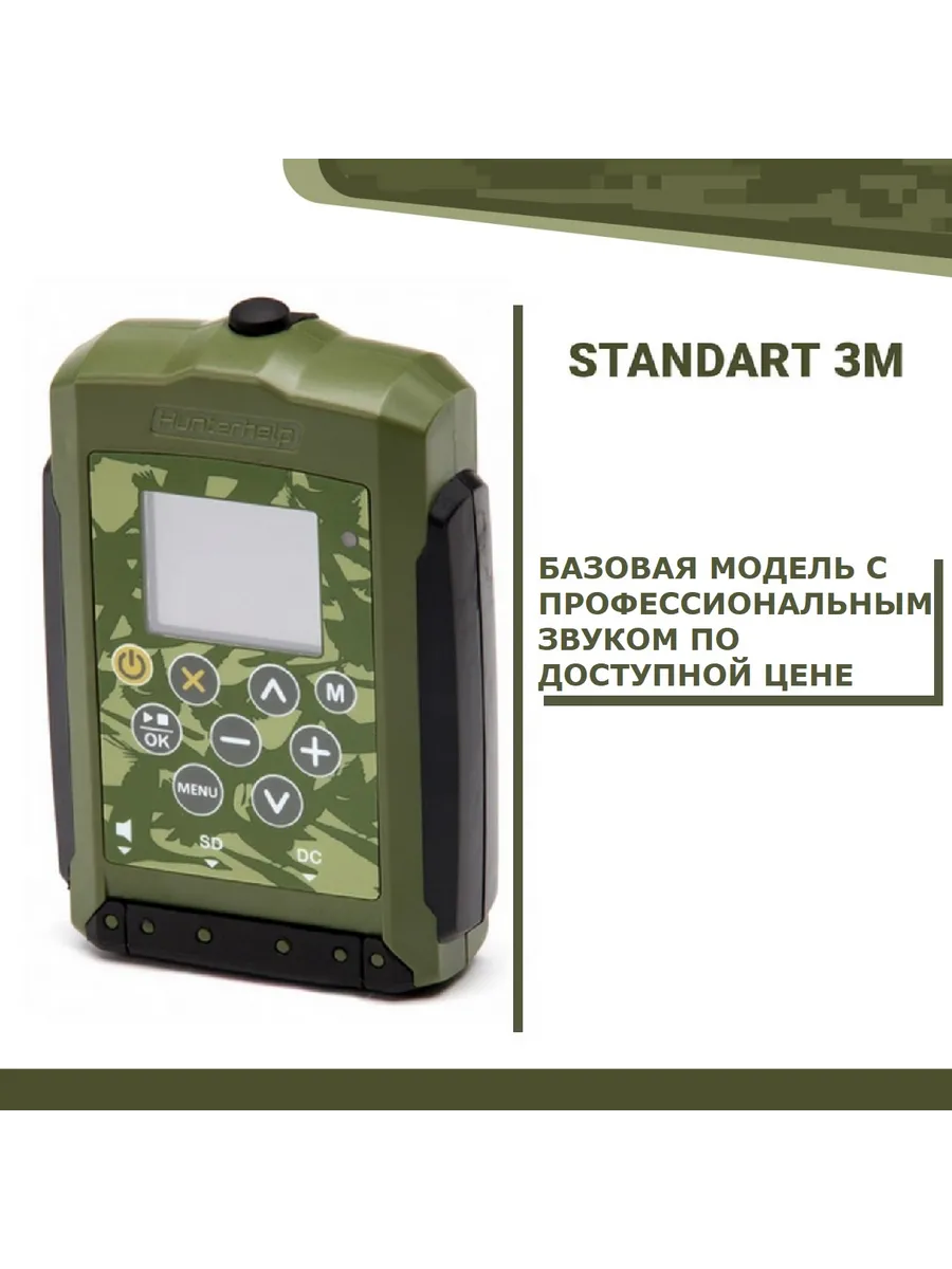 Hunterhelp Standart 3M — эффективный, громкий и надежный манок по доступной цене! С новым большим TFT дисплеем! Удобная настройка. Динамик ТК9-RU реалистично воспроизводит голоса гусеобразных, кабана, косули, вороны. Направленный рупор существенно увеличивает дальность подманивания. Может быть использован для манения утки, селезня, гуся, и многих других видов животных. Карта памяти с фонотекой криков и голосов в комплекте.