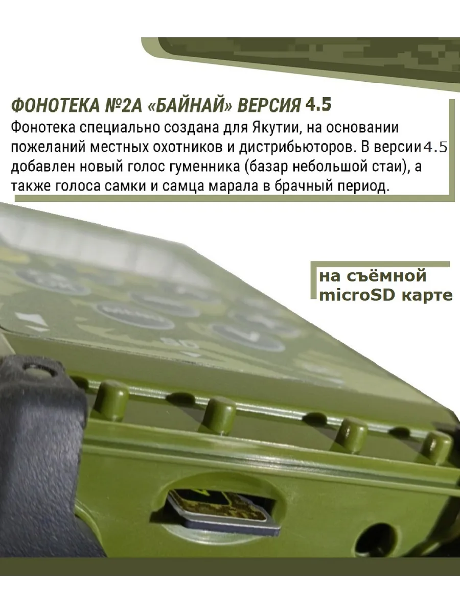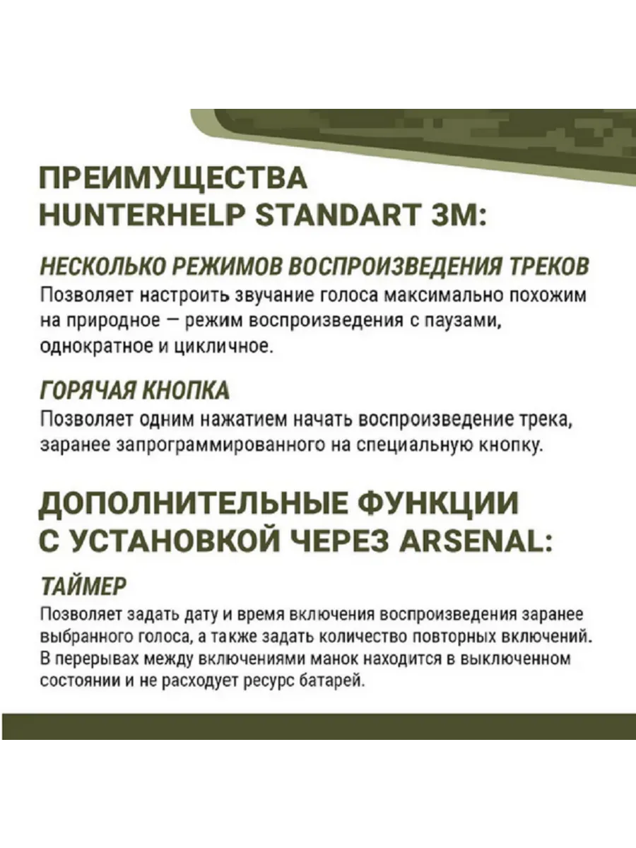 Поддерживает сервис Arsenal, позволяющий обновлять фонотеку и прошивку электронного манка Hunterhelp, не выходя из дома.