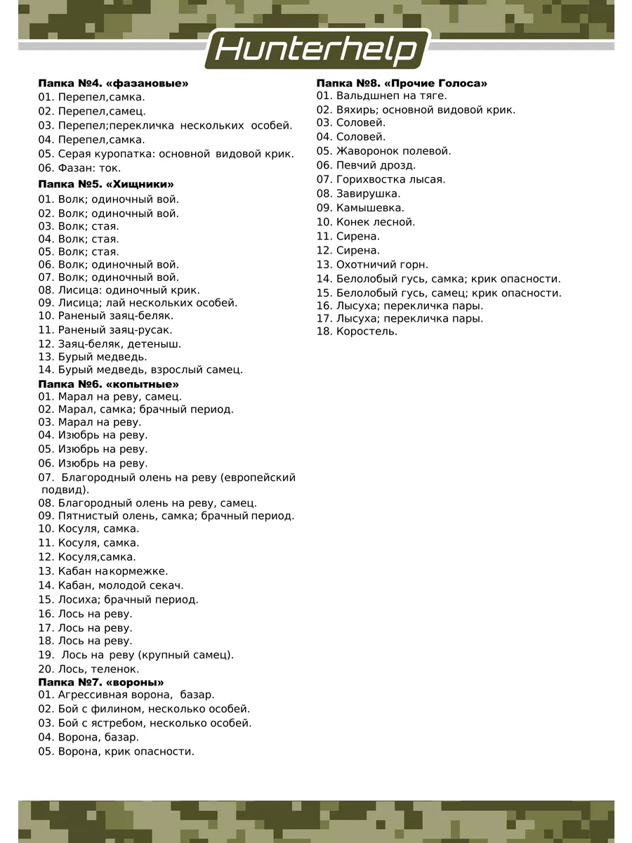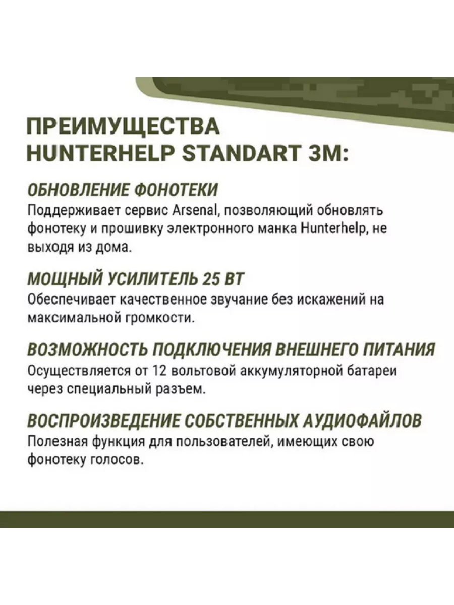 Поддерживает сервис Arsenal, позволяющий обновлять фонотеку и прошивку электронного манка Hunterhelp, не выходя из дома.