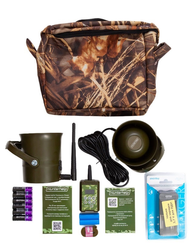 Данное предложение представляет полноценный комплект, к нему не нужен дополнительно электронный манок. Управляется пультом дистанционного управления с цветным дисплеем, где видны названия треков, состояние заряда и все регулировки звука.и Дальность дистанции до 50 метров в прямой видимости без помех.