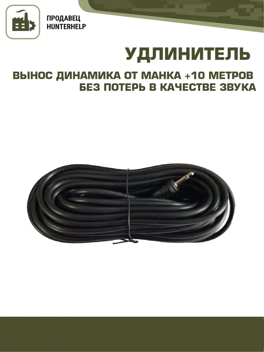 Длина 10 метров, это максимальное расстояние без потерь по качеству звучания. Позволяет устанавливать динамик вместе с профилями, чучелами и т.д., при этом манок находится в засидке. Также идеально подходит для использования с усилителями (для разнесения динамиков от усилителя и для удаления усилителя от манка).